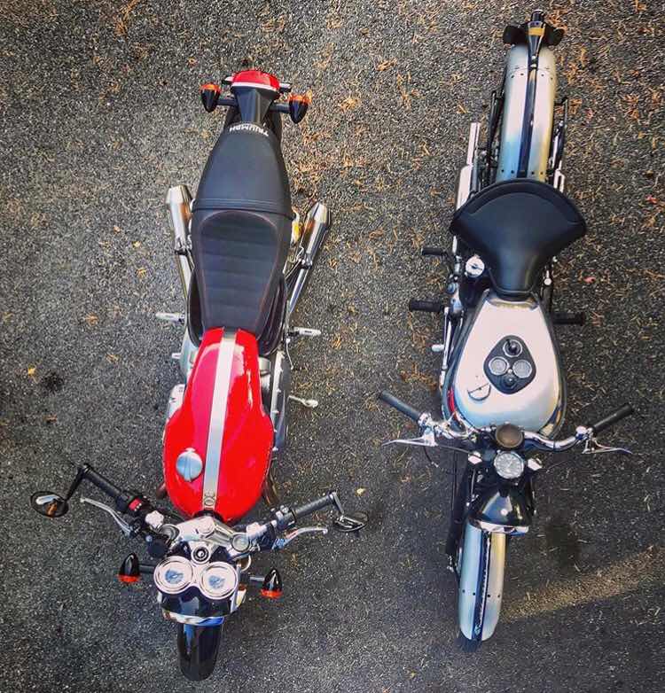 1947 Triumph T100 Tiger flanked by a 2016 Triumph Thruxton R.